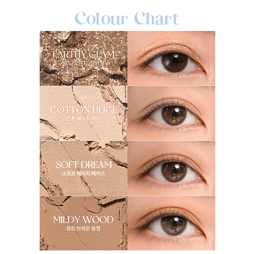 In this romand palette, you’ll find 2 deep mattes for shading, 4 lighter honey-toned mattes, and 4 gorgeous complementary glitters in various textures to bring your K-Beauty look together.