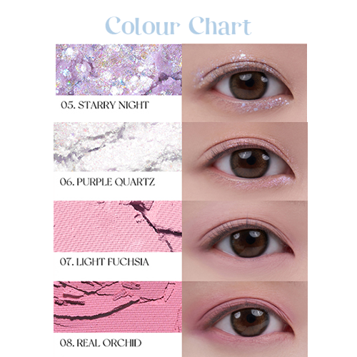 In this palette, you’ll find deep plum mattes for shading, soft pinks for daily looks, and gorgeous complementary glitters in various textures to bring your look together.