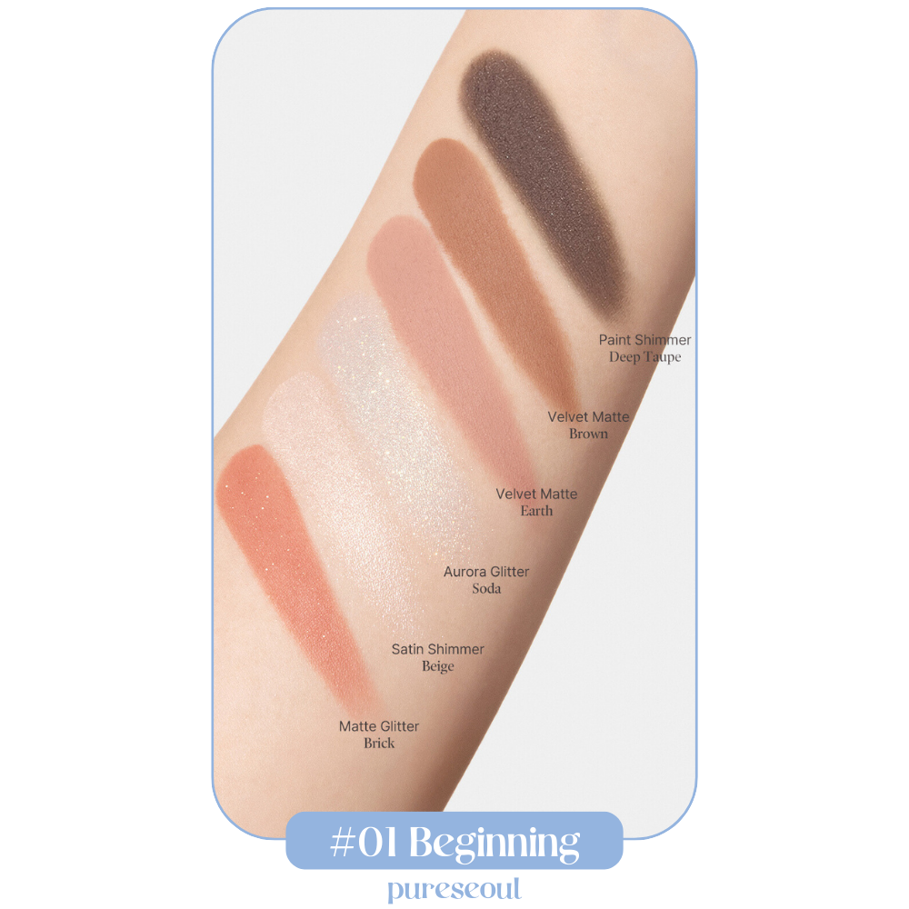 #01 Beginning: an earthy warm-toned palette with a combination of 6 beige, brown and terracotta shimmers and mattes, along with touch of a sparkle from a neutral glitter that completes any eye look.