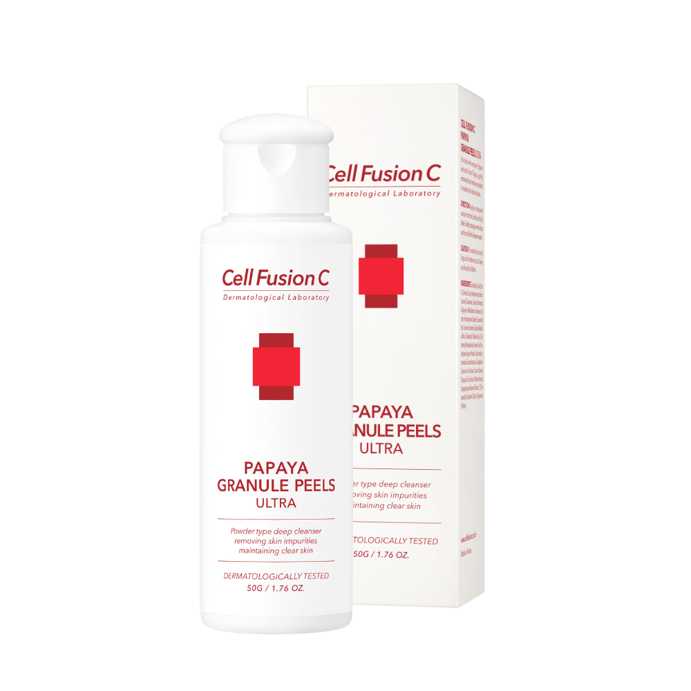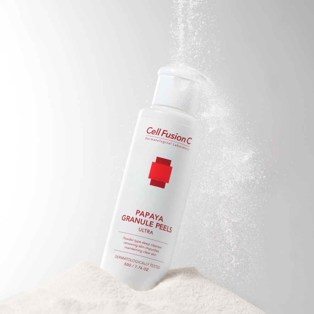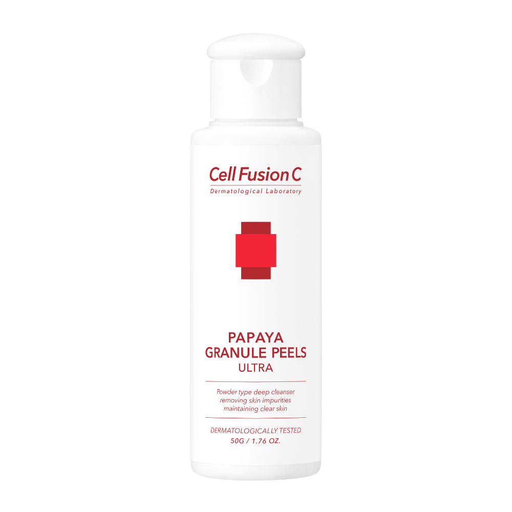 Cell Fusion C‘s Papaya Granule Peels Ultra is a powder-based cleanser and gentle exfoliator for sensitive skin, effectively washing away impurities while providing a refreshing daily cleanse.