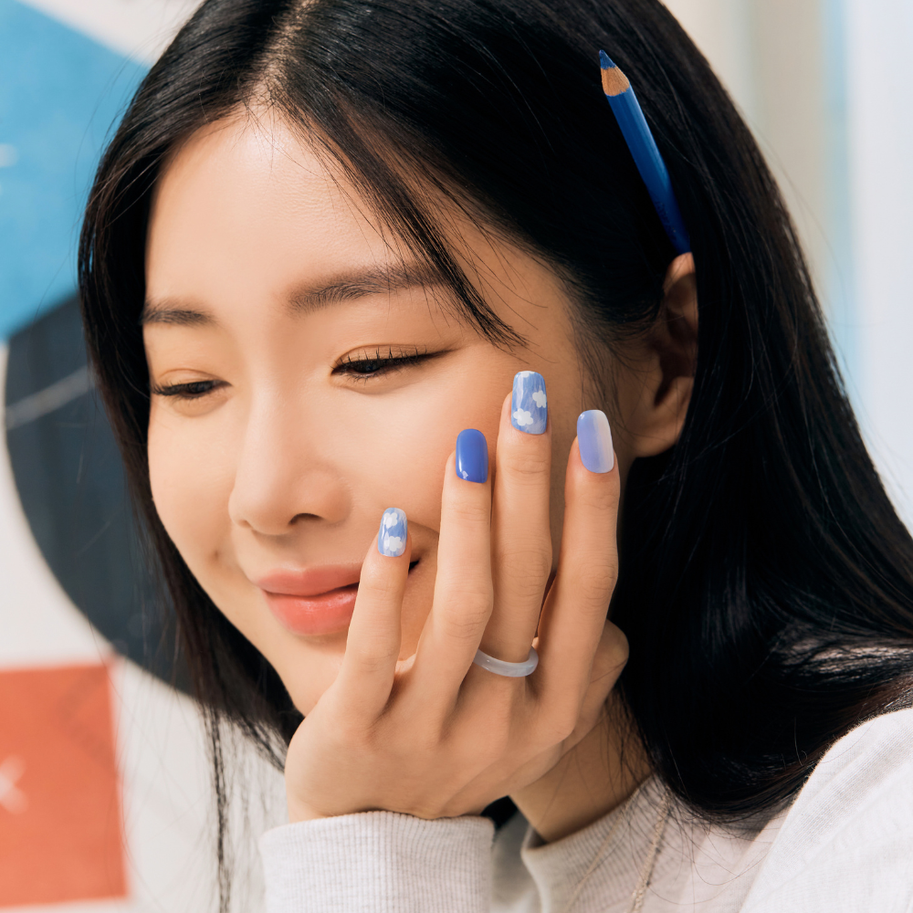 #N Cotton Cloud — with a sky-blue ombre, adorable puffy white clouds, and smiley nail art, this manicure captures the joyful feeling of a sunny summer day.